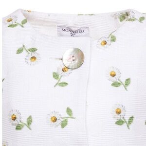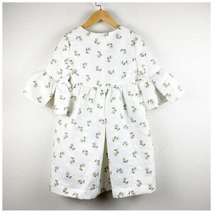 The finest topcoat, of precious ottoman fabric with embroidered mini daisies, slightly flared, maxi buttons and spectacular sleeves