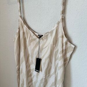 Features: adjustable spaghetti straps, subtle zebra print, cami/slip style, loose fitting, mini length
