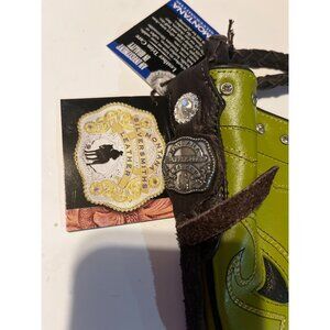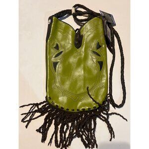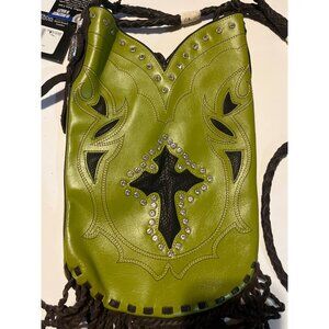 This stylish NWT Montana Silversmith crossbody purse combines a vibrant green leather design with intricate western details, including a rhinestone-embellished cross and fringe accents for added flair.
