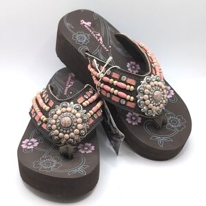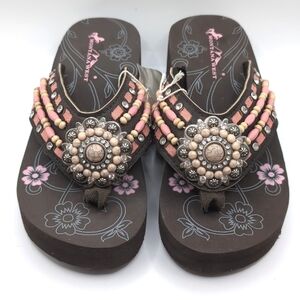NWT Women's Montana West Brown Beaded and Jeweled Sandals. Size 6. These Casual Sandals are gorgeous with beads sewn on and additional studded rhinestone decor. Bottom has 1 inch base sole with heel being 2 inches high. Large Round Design featuring Tan Beads and Rhinestones is center-stage. Additional sewn on pink and tan beads with rhinestone accents complete the stunning look across the top of each sandal. Excellent New Condition. No Flaws.