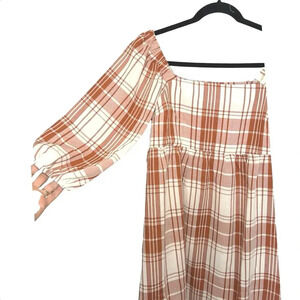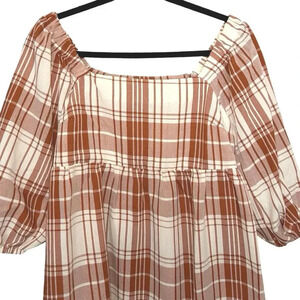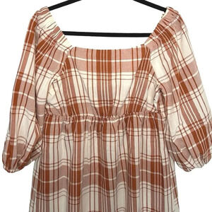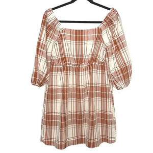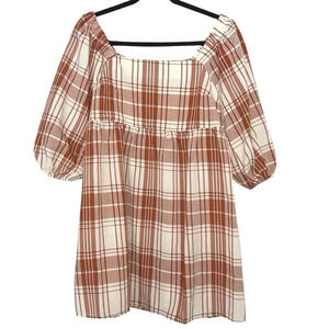 Monteau plaid babydoll dress size medium. In the pattern pumpkin plaid and with 3/4 inch puff sleeves. Elastic cuffs and waist. Square neckline with an easy skirt fit and sleeves that can be worn off the shoulders if you wanted to. Fitted bodice and hits just above the knee. Brand new with tags! Measurements: length- 32 inches and Chest (underarm to underarm)- 17 inches . 100% polyester