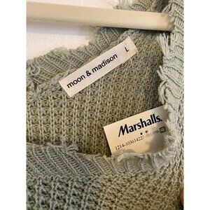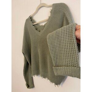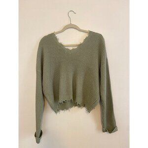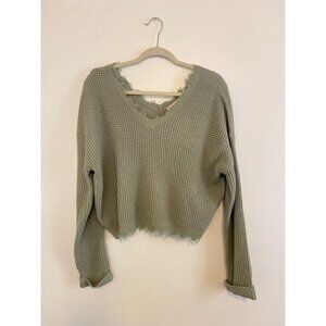 NWT Moon & Madison Sage Green Shark Bite Distressed Knit V-Neck Sweater Size L