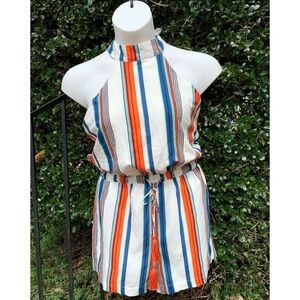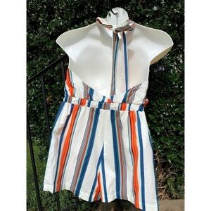 Super cute and perfect for spring and summer! This brand is sold at Anthropologie, and this romper features an all over stripe print, a halter neckline that ties at the neck, a drawstring at the waistline with tassels at the ends, and it is fully lined. The back is an open back, which helps to make the bow that much more dramatic.