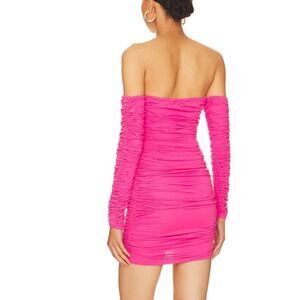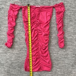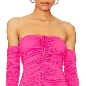 NWT no flaws. Current season and still online! This size sold out! Features: • 92% polyester, 8% spandex • Made in China • Hand wash • Unlined • Pull-on off the shoulder styling • Front tie detail • Lightweight ruched jersey fabric • Neckline to hem measures approx 27" in length • Revolve Style No. MOTO-WD263 • Manufacturer Style No. MTD149 Please see pictures for measurements. Smoke free home. Perfect for parties, Barbie, ruched, Gen Z