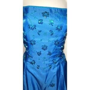 Morgan & Co. "Formal-Prom-Ball Dress" Size 13/14 Classic & Simply Stunning in Ocean Prom. Strapless neckline. "Bones" in bodice. The back laces up for adjustable fit. I did nothing except "tuck in extra" to make this fit my petitie mannequin. Entire gown shimmers. Natural waistline with a sheath A-Line silhouette. Flare skirt with sequins sewn in for additional shimmer. Fully lined, lower 1/3 has tulle. Hidden zipper on the left side.