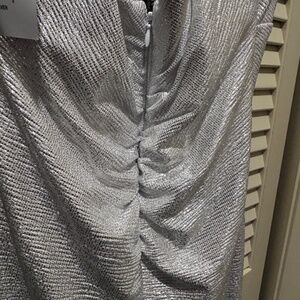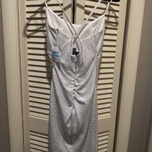 NEW with tags... Classy yet sexy Silver/White metallic sleeveless Juniors/Women's MORGAN AND CO. mini dress has a soft cowl neckline, spaghetti straps in a form fitting silhouette. High-quality materials and meticulous craftsmanship guarantee durability and long-lasting wear, making it a timeless addition to your wardrobe.