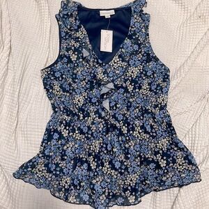 Navy floral print stretchy mesh, lined, v cut with ruffle trims, cinched elastic waist for fit form
