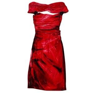 Make a bold statement in this stunning Moschino cocktail dress. Crafted in a luxurious velour blend of viscose and silk, this off-the-shoulder piece features a figure-hugging silhouette and an abstract painterly print in rich, vibrant reds. The gathered, criss-cross bodice adds elegant texture and drama, perfect for special occasions or upscale evenings.