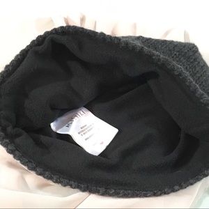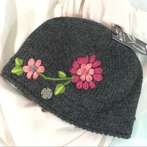 Hand knit in Nepal, this hat is soft and warm! There is a fleece band on the inside for comfort and added warmth. Charcoal grey with embroidered flower accents. New with tags.