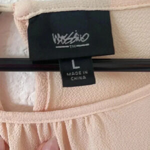 It is a peach top with some lace detail in a tiered style, there is a peep hole at the back, and it is elbow length sleeves.