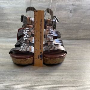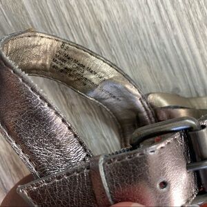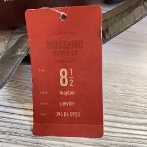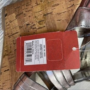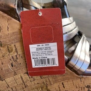 NWT woman’s Mossimo Waylon pewter colored strappy wedge sandal. They are NWT and never worn, but see photo of mark on inside sole cork.