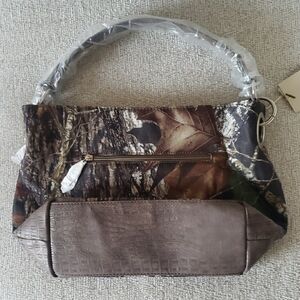 Embrace the outdoors with the Mossy Oak Brown Camouflage Hobo Bag, designed for durability and style. This bag features a nature-inspired camouflage pattern, perfect for those who love an adventurous, casual look. Its slouch-style design and sturdy handle make it an ideal companion for outdoor activities. Has zipper pockets inside. It's a very nice bag.
