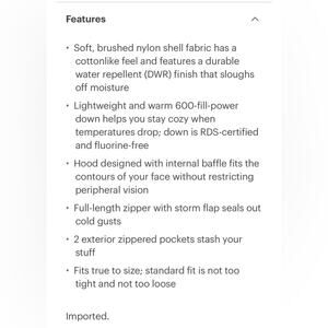 This NEW WITH TAGS hooded Mountain Hardwear jacket is perfect for cold weather. It features 600 fill ethically sourced down/feathers.