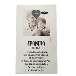 The Mud Pie Grandpa Magnetic Frame is something to treasure. With a removable heart shaped magnet that says Family that holds the photo in place, this magnetic frame makes the perfect keepsake to keep your loved ones close. Whitewashed wood with the definitions of Grandpa.