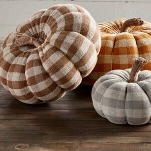 The buffalo check stuffed pumpkin features a brown and white gingham plaid pattern.