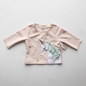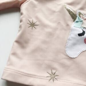 Brand new with tags attached! Mud Pie light pink swim rash guard with unicorn appliqué and gold stars. Absolutely darling, and matches any pastel colored bottoms! Size 12/18m, NWT.