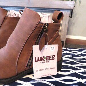 NWT Muk Luks LUK-EES Bethany Faux Leather Ankle Boots Size 8.5. Water Resistant Boots. Brand New with Tags. * My Pic's show the boots a light brown, but they are thw color of the Stock Photo (first pic)