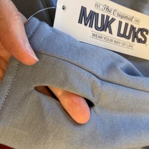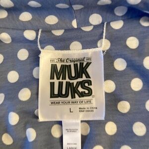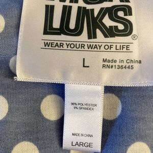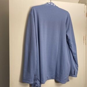 NWT Light Blue polyester/spandex open front jacket. Sleeves have slots (see photo). Measurements: armpit to armpit: 23 inches; length (from shoulder seam): 28 inches; sleeve length 24.5 inches. Interior is light blue with white polka dots. Two side pockets.