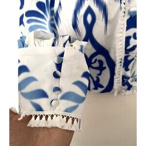 Add a trendy touch with this Mulla print tie-front cropped blouse, size L. Lightweight fabric with long sleeves and a flattering tie-front design creates effortless style. Perfect for casual or dressy looks, pairing beautifully with high-waisted jeans, skirts, or layered outfits. Comfortable, stylish, and versatile for everyday wear.