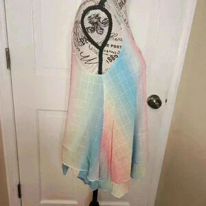 This stylish tank top features a rounded neckline and a striking ombre color pattern transitioning from pale blue to soft pink. The asymmetrical hem creates a flattering drape, making it a versatile addition to your wardrobe. In New with tags condition. Size: Medium.