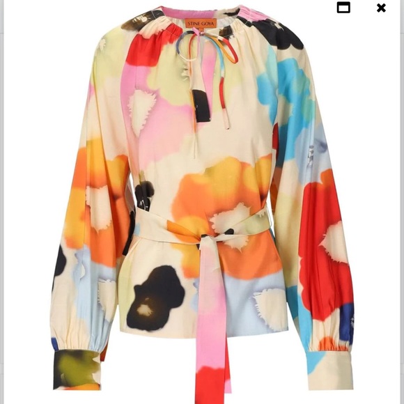 Introducing the Stine Goya Vianna Blouse, a bold yet elegant style for day-to-night dressing. Crafted from 100% ECOVERO™ viscose, this blouse boasts an abstract tie-dye floral print that truly sets it apart. It also features voluminous long sleeves with cuffs, a flattering V-neck and a self-tie waist belt.