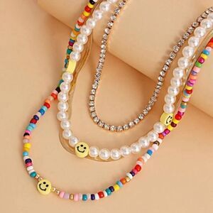 NWT - Multi-layer Smiley Pearl Rainbow Choker Acrylic Colorful Beads 4 Necklaces