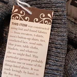 Made of recycled materials. Ribbed waistband. Pockets on the front. Buttons down the front. Gusset at the hem for flare. Ribbed tab with buttons. Back patch pocket with cashmere patch. Size L measures 36-44 at waist, 46 at hips, 66 at bottom hem. 27 long from top of waistband to hem. A very special piece to add to your collection.