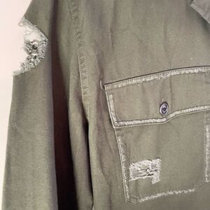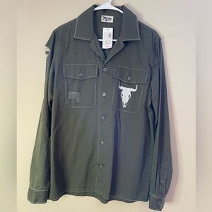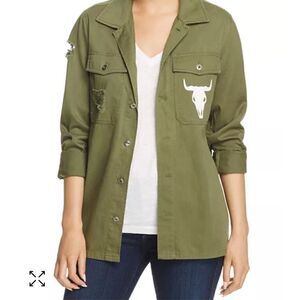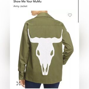 Brand new with tags Mumu army jacket in a stylish olive green. Features a western-inspired white bull skull graphic on the chest pocket, distressed shoulder detailing, and button-up front. Size Small. Originally retailed for $146. Perfect for layering year-round.
