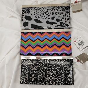 These Mundi Bar Harbor Wallets can be used as a wallet or as a clutch. Several color/print options, with silver trim and clasp. The interior has a center zippered pouch and there are 4 slots for your ID or credit cards. The wallet closes with a secure fastener.