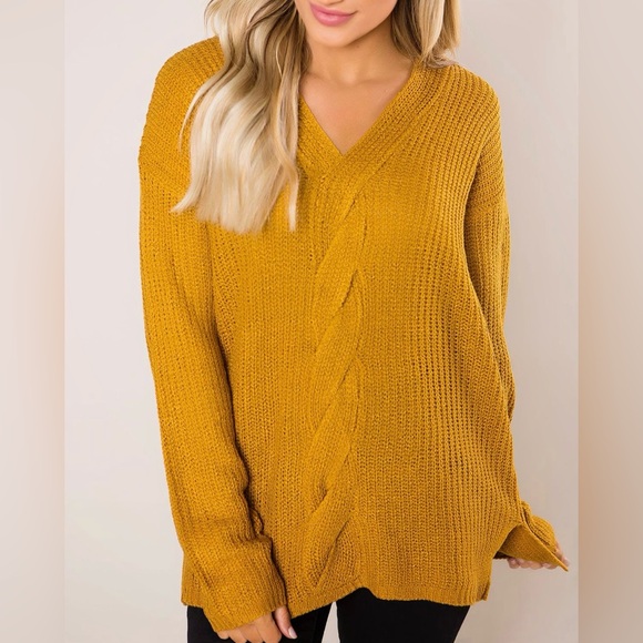 🔑 Keywords: mustard sweater, gold sweater, fall sweater, cozy knit, Dottie Couture, boutique sweater, oversized sweater, V-neck sweater, cable knit, chic fall fashion, NWT sweater, medium sweater