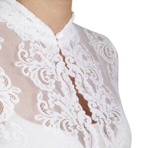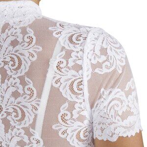 The blouse is made entirely from wonderfully soft white lace and is a real eye-catcher. It has a high-necked design, which is decorated with a delicate button on the neck. The short sleeves are also made from translucent lace with a large floral pattern and are very comfortable thanks to the stretchy material. The elastic under the bust provides the necessary support.