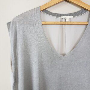 Lightweight neutral top that's a mix between beige and gray - let's call it greige. The front is a lightweight knit sweater and the slightly longer back is sheer.