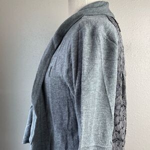 Stylish open front style cardigan sweater measuring 21 inches armpit to armpit laying flat and 32 inches in length from shoulder to the longest point in the hem.