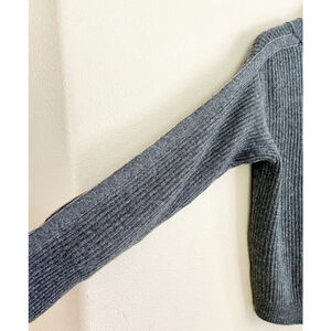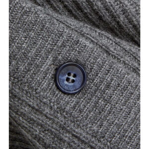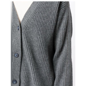 This is a brand new, with tags cashmere, gray cardigan. It features a V-neck design and a button-down front with matching gray buttons. The cardigan is made from a ribbed knit cashmere. The sleeves are long and straight with Monili beading, and the hemline is straight. There are no visible imperfections. The cardigan is in excellent condition.