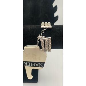 This NWT Napier bracelet is a stunning piece of fashion jewelry, featuring a sparkly silver tone with three rows of crystals for a layered bangle design. The bracelet is adjustable, making it versatile for different wrist sizes and preferences. It is signed by Napier, ensuring authenticity and quality craftsmanship. The overall aesthetic is elegant and stylish, perfect for adding a touch of beauty and sparkle to any outfit, making it a fashionable statement piece for any occasion.
