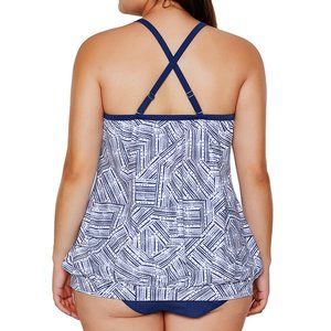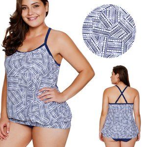 NWT (NEW IN SEALED BAG) NAVY/WHITE BLOUSON 2 PIECE TANKINI SWIMSUIT PLUS SIZES LARGE, and XL TOP with LARGE BOTTOM