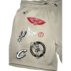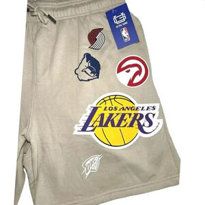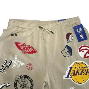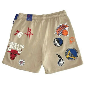 NBA One For All basketball shorts size XL. Brand new with tags! Made from very soft and comfy fleece fabric. Depicting various NBA teams all over shorts. Elastic waistband with a drawstring. Hits at the knee and in the color Sand. Very cool and perfect for the basketball lover. Measurements: inseam- 7.5 inches and Waist (laying down flat)- 18 inches