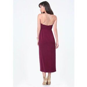 Fully lined midi dress in red wine with a slit at right thigh. Cross back detail and zipper closure.