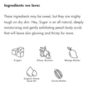Ingredients may be sweet, but they are mighty tough on dry skin. Hey, Sugar is an all natural, deeply moisturizing and gently exfoliating peach body scrub that will leave skin glowing and thirsty for more.