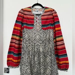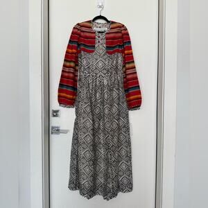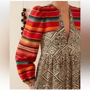 Our mixed-pattern prairie dress features a striped handwoven cotton that hugs the dress like a long-sleeved bolero. Also crafted from a hand-printed Tencel, the geometric print dress has a romantic silhouette with a V-neckline and a gathered skirt. One of our favorite fits and easy to wear.