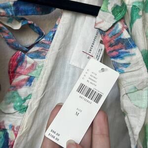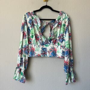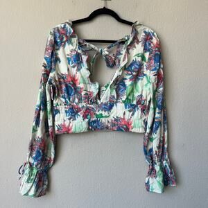 NEW Anthropologie vibrant abstract watercolor floral blouse featuring a deep V neckline with ruffle trim, tie-back detail, and long sleeves with gathered cuffs. Made from 100% cotton with a light crinkle texture and cropped silhouette with smocked waist. New with tags. Size Medium -