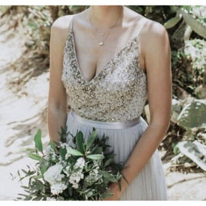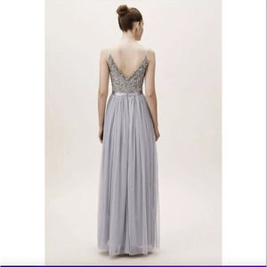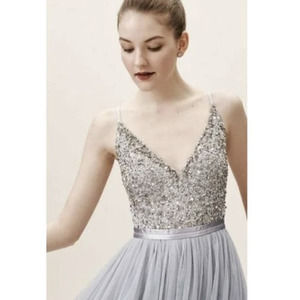 Part of a special collection from BHLDN. For the full assortment, visit BHLDN.com. Featuring a deep v-neck and matching back, this sleeveless dress pairs a sequin-covered bodice with a frothy tulle skirt. A grosgrain ribbon defines the waist.