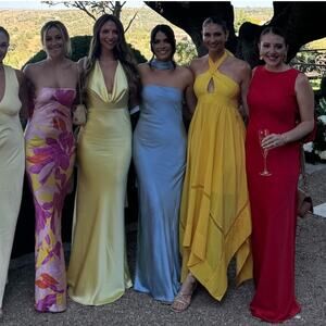 Embrace timeless elegance in our strapless satin bias cut gown with a long sash designed to drape around the neck, it's a statement of sophistication.