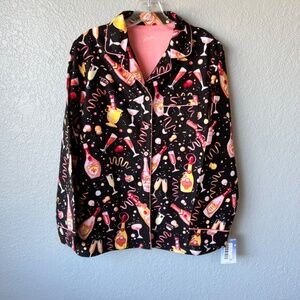 What fun for the holidays! Hard to find in new condition.Charming pajama set with colorful drink designs. Button-up top and long sleeves. Ideal for relaxing evenings.