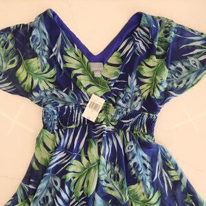 NWT NEW Rabbit Rabbit Rabbit AOP Leaves Nature Smocked Waist V neckline Midi Dress with Asymmetrical Bottom. Pullover dress features bold all over print nautical leaves blue and green. Flowy, lightweight chiffon fully lined. Figure-flattering shirred elastic waist and flutter short sleeves