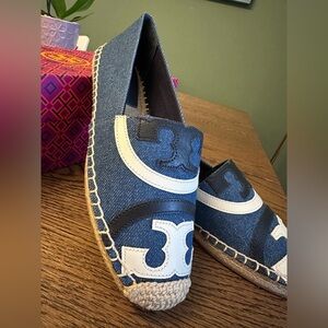 NWT! NEW! Tory Burch Poppy Canvas Leather Mixed Espadrilles -Denim Size US 5.5