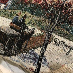 It is a Woven Tapestry designed pillow, NOT a print, tag in place. Awesome colors on the front side and solid white on the back. It says.... " From Sweet and Tender Yesterdays I'm Glad Our Hearts Find Rest There With Gentle Memories And Friends Who Know Us Best " What an awesome gift this would make to a very special friend or daughter. The scene is a Horse drawn open wagon being pulled towards a Church. It could be a Christmas setting or just a Winter setting but it's lovely either way. Very well made and stuffed fully as a well made pillow should be. It will be shipped in the clear plastic opened top bag we received it in from the maker.