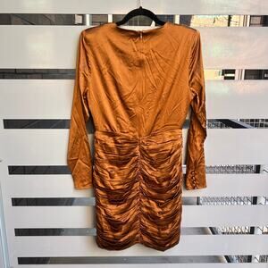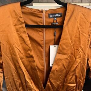 NEW with tags retrofête 'Brea' bronze satin silk-blend mini dress. Plunging V neckline. Hidden back zip closure. Ruched fabric detail at skirt. Padded shoulders. Fully lined. Dry clean only. Size medium - 18" pit to pit; 14" waist; 34.5" length from shoulder; 25" sleeves.