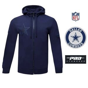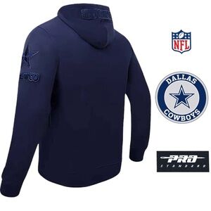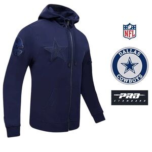 Stay stylish & comfortable w/this gorgeous Pro Standard NFL Dark Navy Blue Tone on Tone Embroidered Dallas Cowboys Zip Front Long Sleeved Hoody. Perfect for fans, this jacket features a sleek design, super soft high-quality material w/a great weight to it & beautiful high quality thick embroidered patches in each logo + emblem on top of each sleeve, across top of the hood & on front L-chest. Can be worn dressed up or down, any time of year.