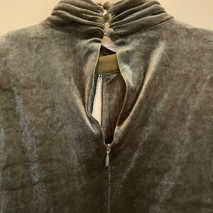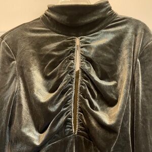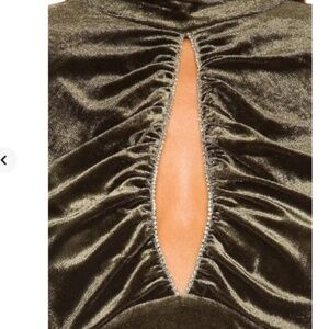 95% poly 5% spandex. Made in China. Dry clean only. Fully lined. Hidden back zipper closure. Back keyhole with loop button closure, Padded shoulders. Front cut-out with crystal embellished trimVelvet fabric with ruched sides.